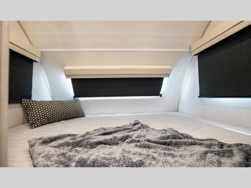 Each one is built with a sealed underbelly with forced heat for added protection against the elements, plus a curved dual-pane acrylic front window with a bug screen and night shade for great outdoor views and natural lighting. You will also find seamless Surf-X kitchen countertops, a central vacuum system, blackout roller shades throughout, and many more comforts.